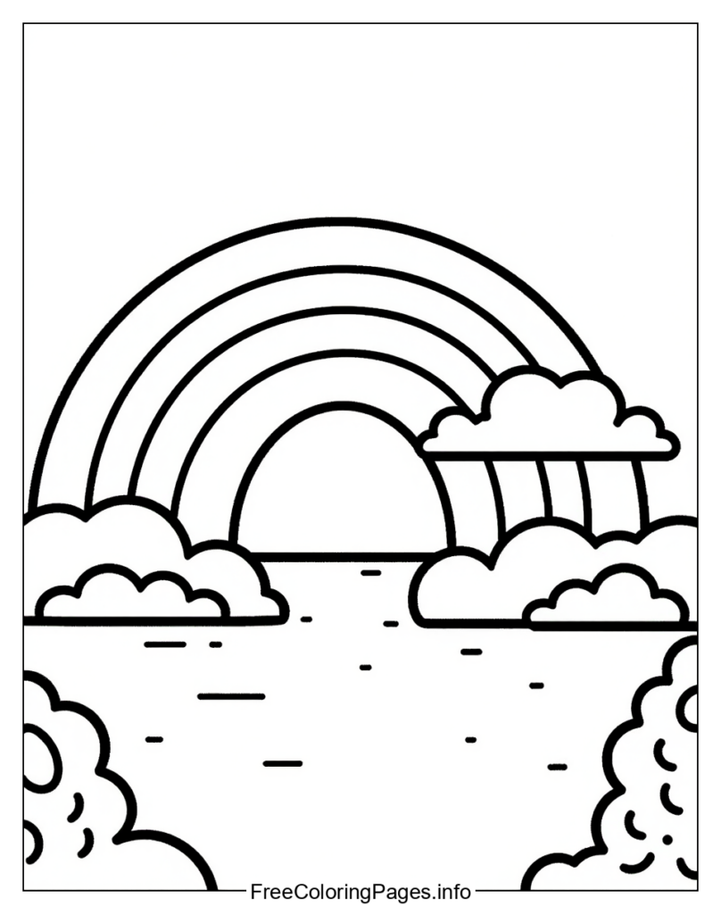 • 1. Rainbow Over Water: Fill the sky and clouds above the rainbow with bright blue colors, add some fluffy white or light gray clouds around the rainbow, and paint the water below in a calm shade of blue or green.