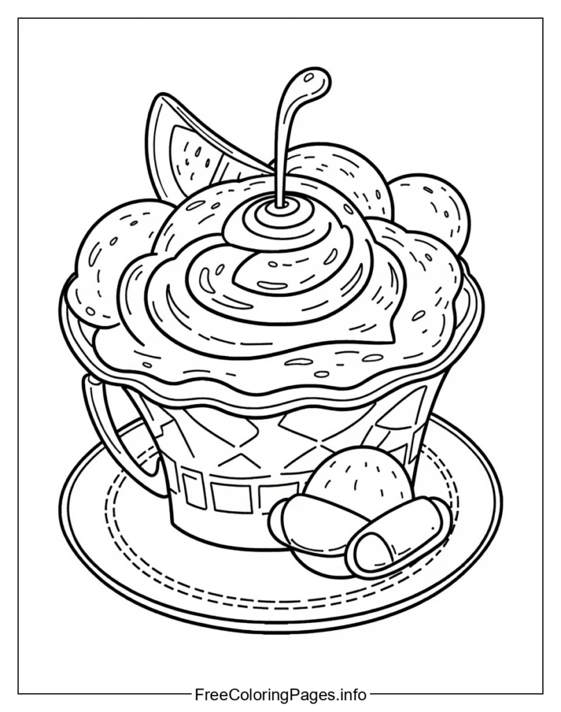 • This black and white food image depicts a cupcake on a saucer with a dollop of frosting, an apple slice as the cherry on top, and two small apples to the side. Here are five different ways you can color it: