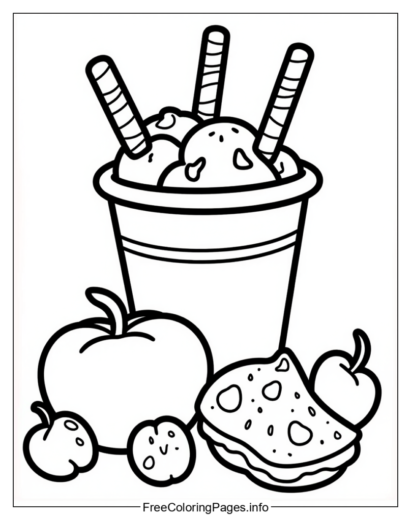 • 1. Pizza Party: The coloring page features an ice cream cone, a slice of pizza, and some fruit. You could replace the ice cream cone with a pizza to make it look like the two foods are being enjoyed together.