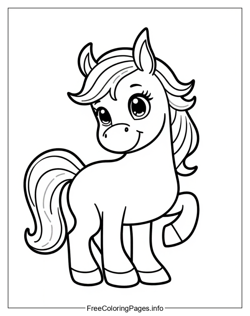• The image shows a cartoon horse in black and white, which would be ideal for multiple coloring techniques. Here are five ways to color the pony: