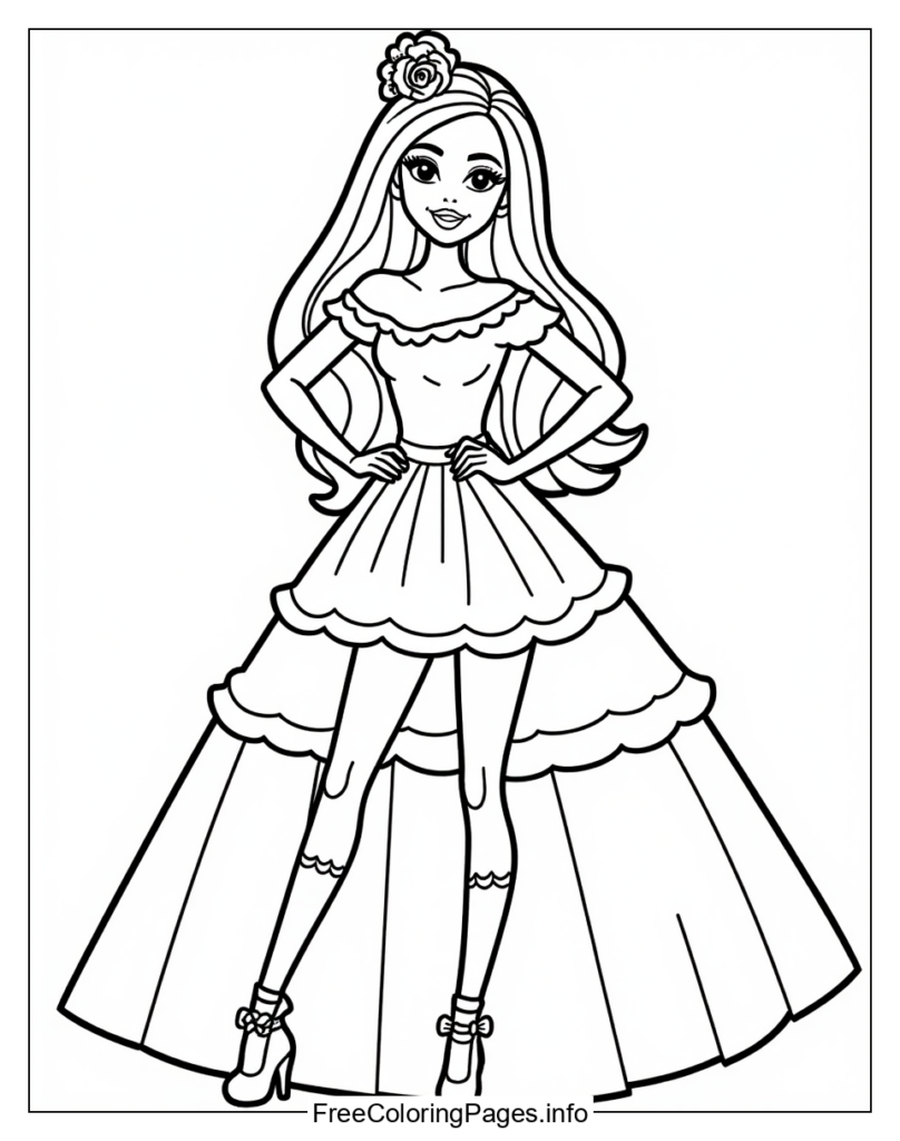 • 4. Color the accessories: Color in the flower on Barbies head, her earrings and necklace, and any other accessories she is wearing.