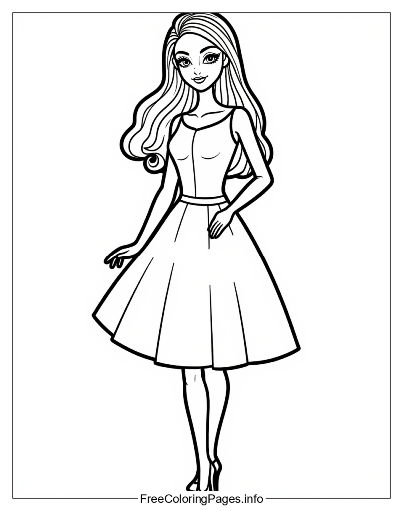 • The image depicts a black and white line drawing of Barbie wearing a dress. There are five potential coloring options:
