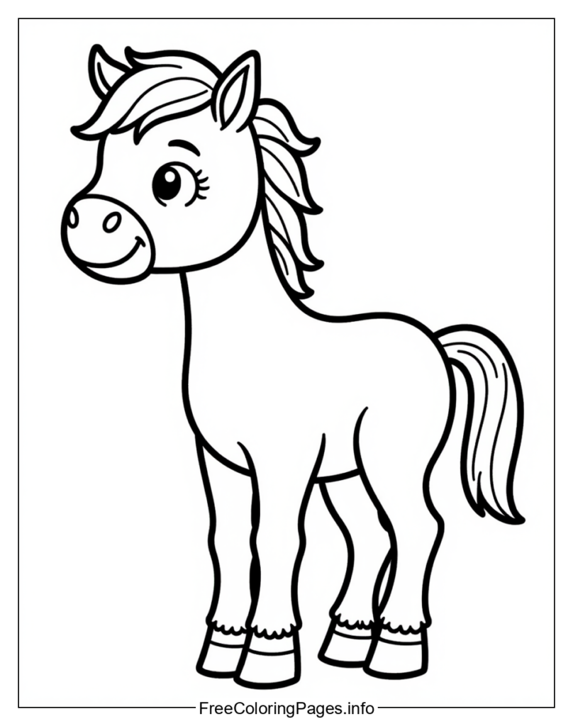 • This black-and-white illustration of a cartoon-style pony can be colored in various ways, depending on the artistic style and color preferences you choose.
