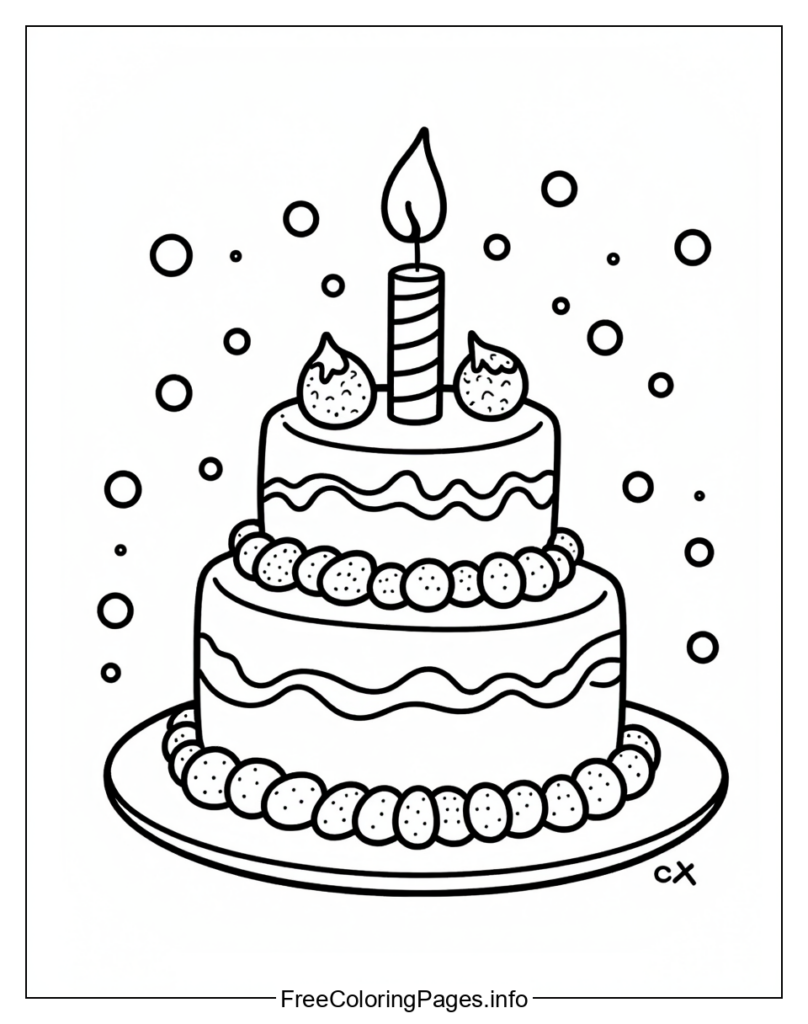 • 4. Rainbow Coloring: Color the entire image with a rainbow theme. Use red, orange, yellow, green, blue, indigo, and violet to create a colorful birthday cake.