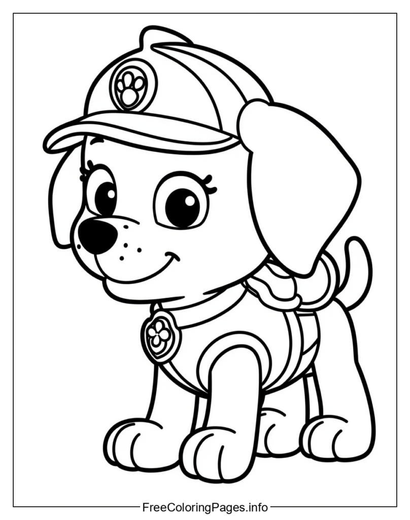 • This is the image of a black and white line drawing of a cartoon dog wearing a hat, possibly Marshall from Paw Patrol.