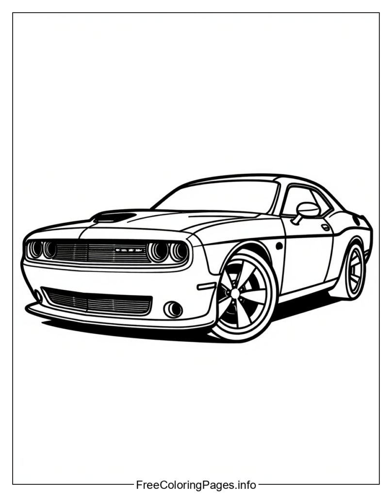 • Here are five coloring page ideas for the Dodge Challenger in the image: