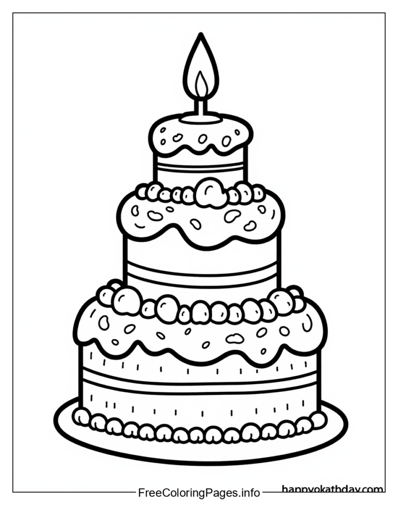 • This Happy Birthday image is a line art drawing of a three-tiered birthday cake with a lit candle on top. Here are five coloring page ideas: