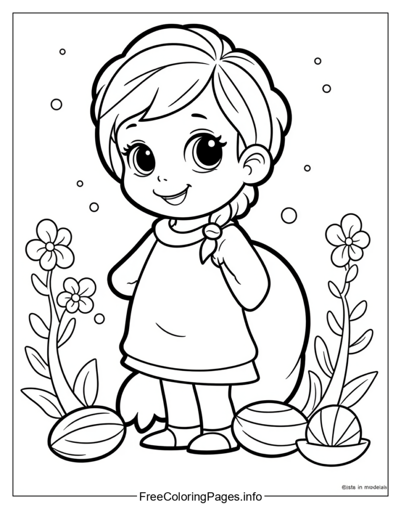 • The image provided is a black and white line drawing of a young girl smiling in an open field, surrounded by flowers and grass. It does not appear to be related to the Frozen franchise.
