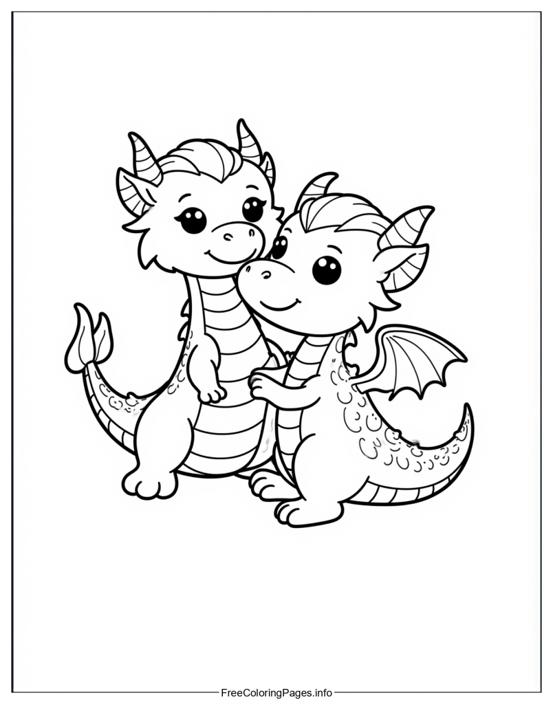 • 4) Mermaid and Dragon Friendship: Color one of the dragons as a mermaid by adding fins and a tail instead of legs. You can color the other dragon as a regular dragon. This coloring page is perfect for kids who love fantasy stories about friendship between different creatures.