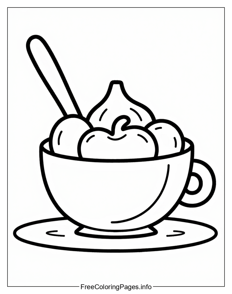 • This black and white line drawing of a bowl of three scoops of ice cream is an excellent opportunity to unleash your creativity and imagination.