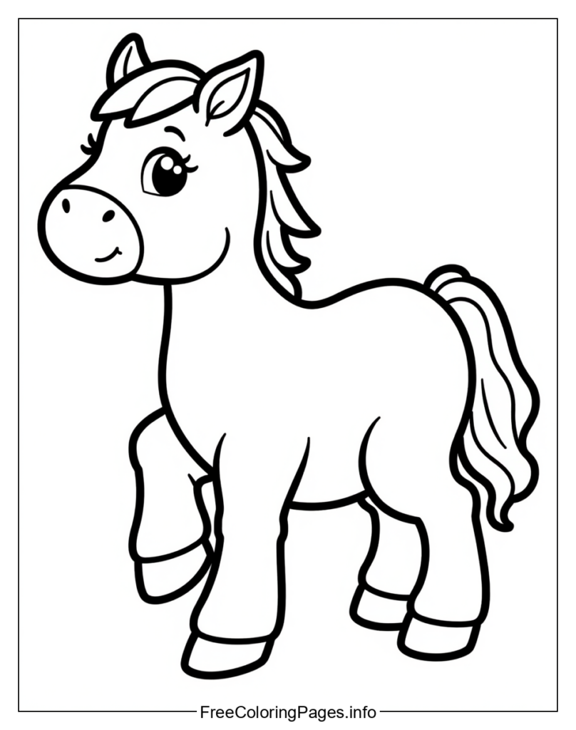 • This image is a black and white line drawing of a cartoon-style horse, featuring simple shapes and minimal details. Its an ideal canvas for children to unleash their creativity and explore different themes, colors, and artistic expressions.