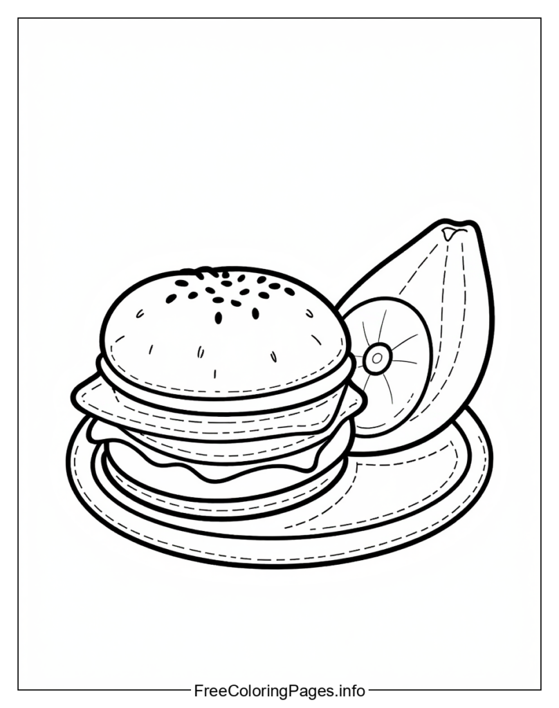 • Here are five food-themed coloring pages that would be great to color in addition to the image of a burger and fruit: