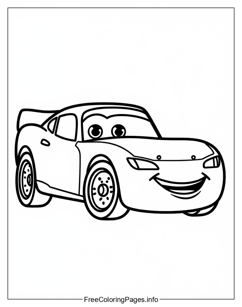 • The Cars image is a black and white outline drawing of the character Lightning McQueen from the Disney movie Cars in his iconic red color. Here are five different coloring ideas for this image: