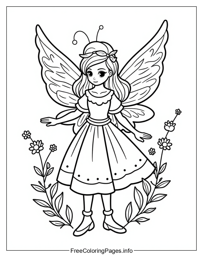 • 1. Rainbow Fairy: Color each part of her outfit a different color from the rainbow (red, orange, yellow, green, blue, indigo, and violet). Her dress could be red, her wings orange, her headband yellow, her socks green, her shoes blue, her antennae indigo, and her boots violet.