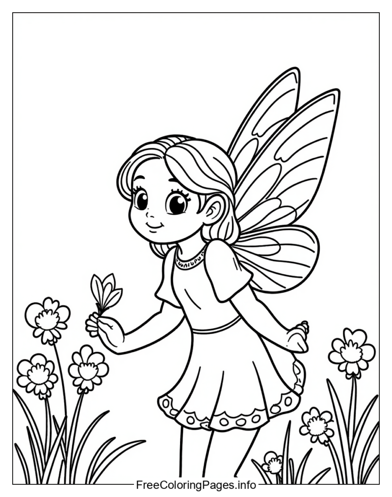 • 2. Nature Surroundings: Color in the flowers and grass around the fairy with soft green, yellow, pink, or purple hues to create a natural scene.