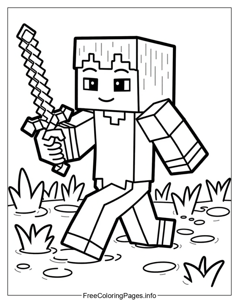• 1. Minecraft Character in a Swamp: Color the character in shades of green and brown, adding subtle texture to the grasses and water lilies. You can use yellow or orange for the characters sword.