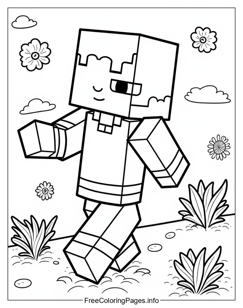 • This black and white Minecraft coloring page features a blocky character walking through the wildflowers in front of him, surrounded by flowers and clouds. Here are five unique color schemes you could use to bring this scene to life:
