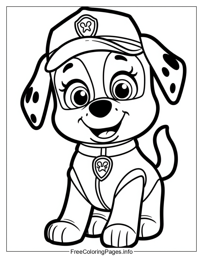 • This black and white line drawing of a cartoon puppy in a hat would be fun to color with the following five themes: