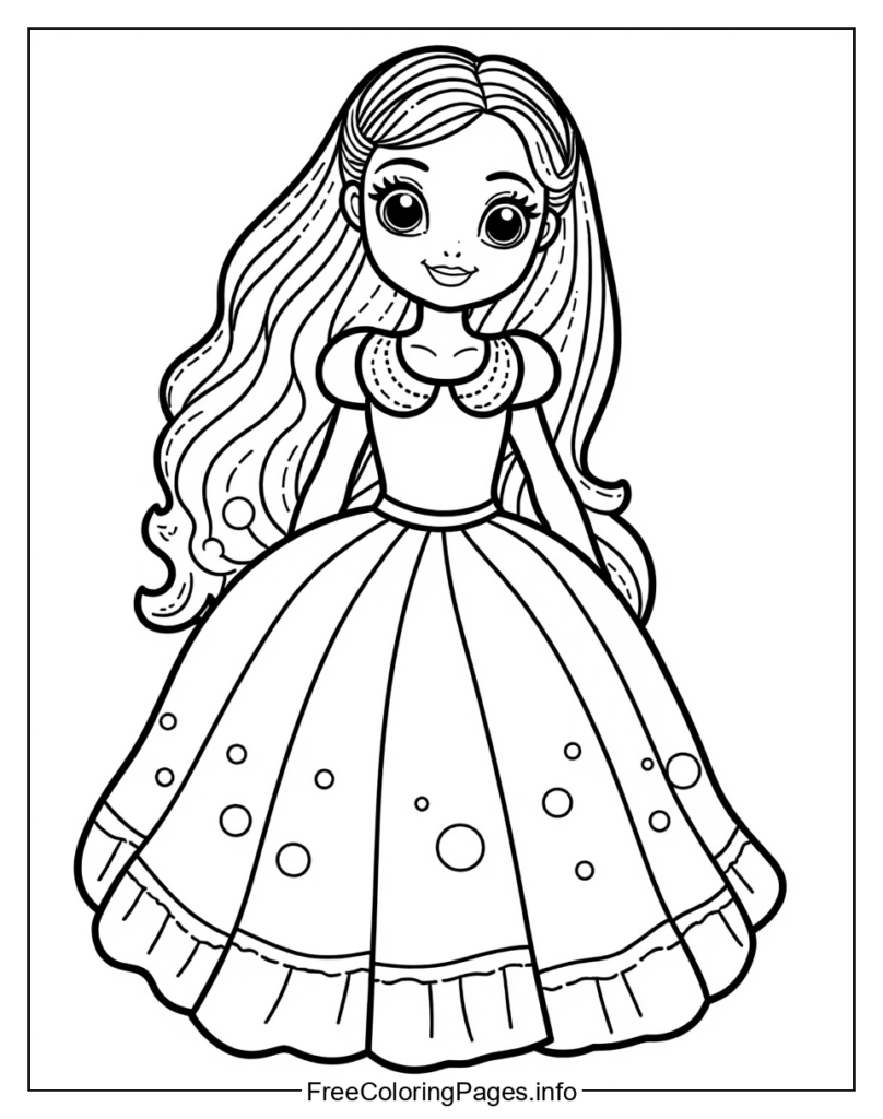 • This coloring page features a black and white line drawing of Princess Barbie in a long dress.