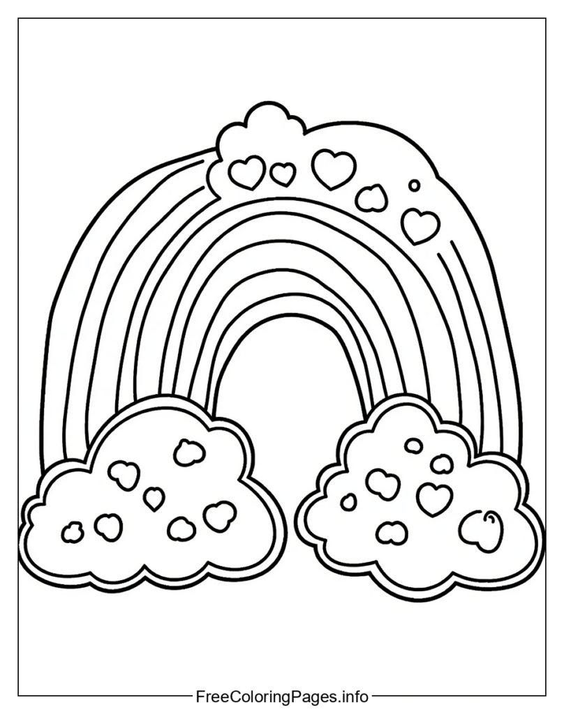 • 3. Color hearts on the clouds: Rainbow images usually depict a cloud at either end of the rainbow. Use red, pink, purple or any other color you like to draw several hearts on each cloud.