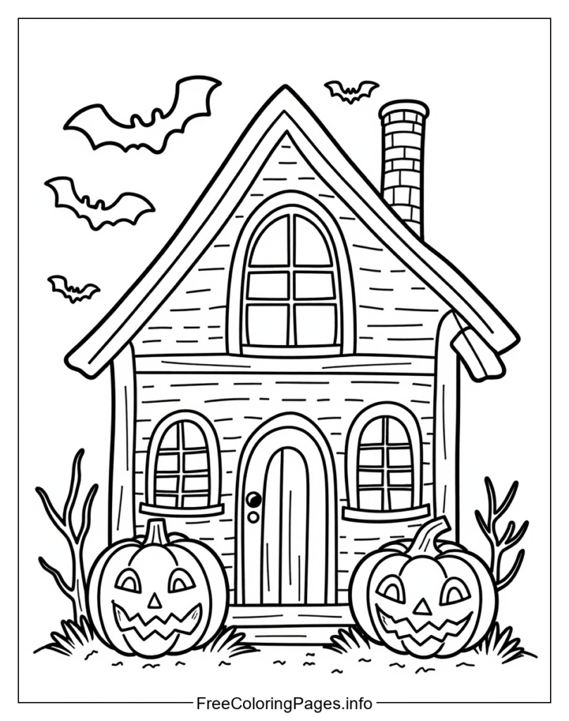 • The provided image is a black and white outline of a haunted house, which can be colored in various ways. Here are five specific coloring ideas: