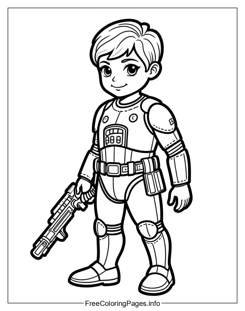Star Wars Coloring Page of a Child in Stormtrooper Armor Holding Blaster Rifle