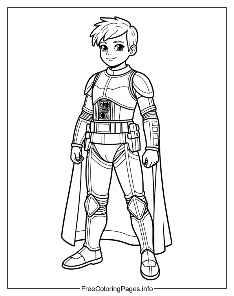 • Here are five coloring page ideas for the image of a young Star Wars character dressed in a costume: